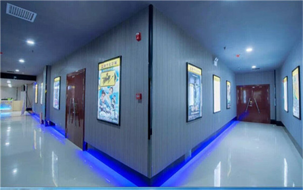 湖南郴州湘華電影城共采用三種吸音材料:環(huán)保槽木吸音板、生態(tài)木穿孔吸聲板、防火聚酯纖維吸音板。電影院收銀臺(tái)墻面與吊頂位置采用生態(tài)木穿孔吸音板、影城走廊兩側(cè)采用環(huán)保13/3槽孔吸音板。影視廳內(nèi)墻面采用聚酯纖維吸音板。聚酯纖維吸音板共用800┫,環(huán)保槽孔吸音板210平方米,生態(tài)木穿孔吸聲板185平方米。