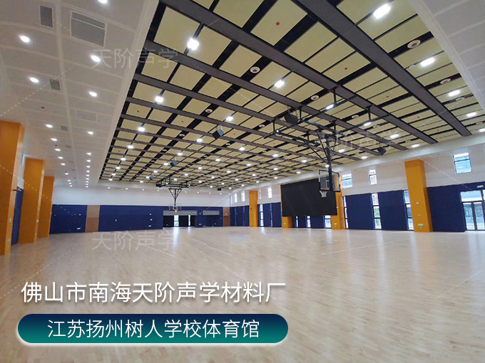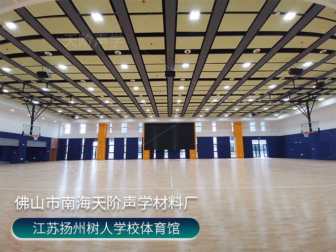 江蘇揚州樹人學校體育館項目,使用平板吊頂空間吸聲體用頂部吸音裝飾;墻面選用白色+深藍色色調飾面的槽木吸音板,基材選用不燃的玻鎂基材,裝飾設計美觀,有出色的降噪效果。