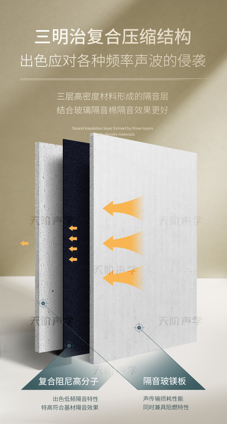 阻尼隔音板采用玻鎂基材,夾加高分子阻尼膠,三文治結(jié)構(gòu)高壓復(fù)合成型,形成阻尼復(fù)合結(jié)構(gòu),改變原材質(zhì)共振頻率,倍數(shù)提升原有材質(zhì)空氣隔聲量和結(jié)構(gòu)隔聲量。