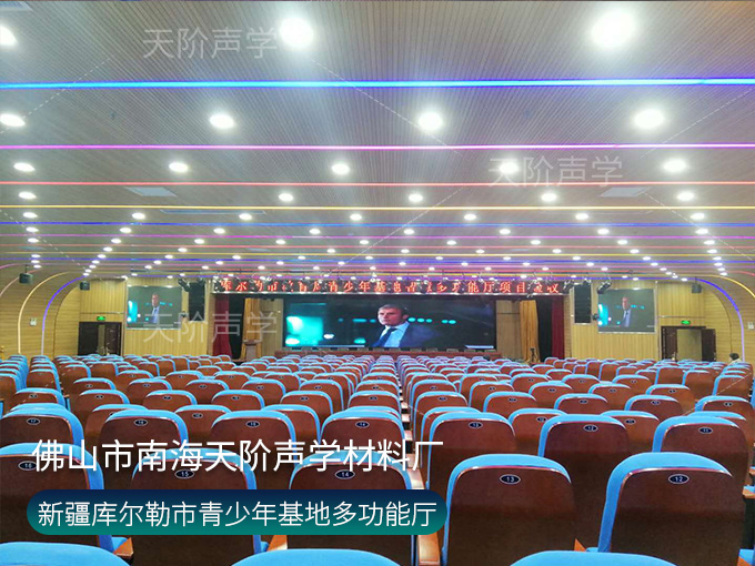 新疆庫爾勒市青少年基地智慧多功能廳項目,天花板和墻面都選用槽木吸音板,基材采用不燃玻鎂基材,安心安心。