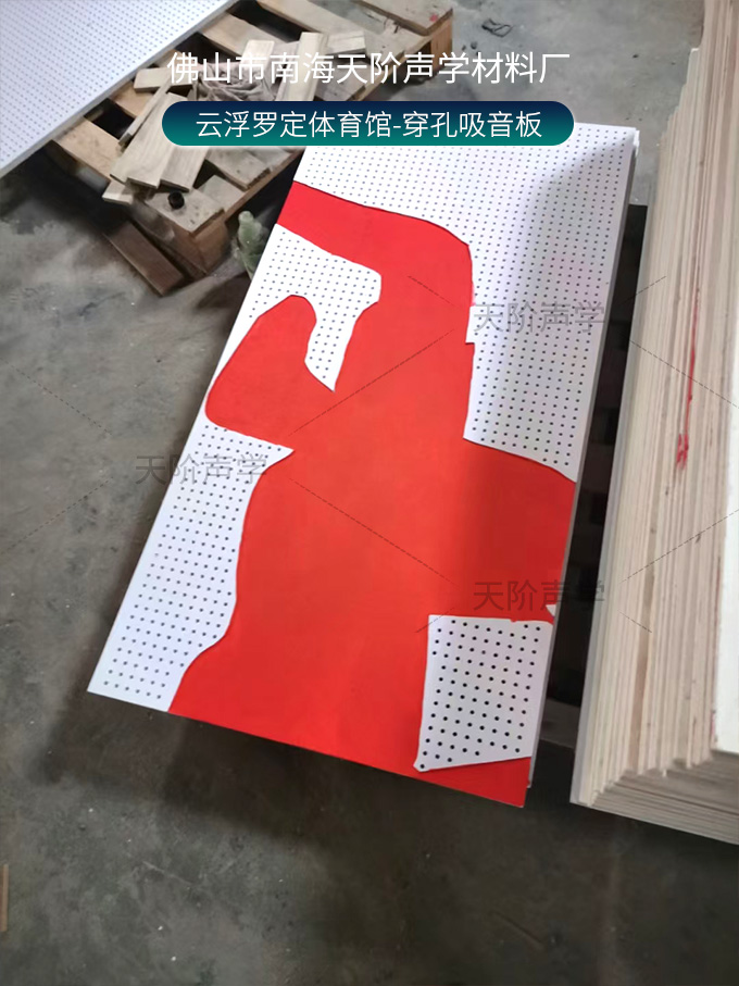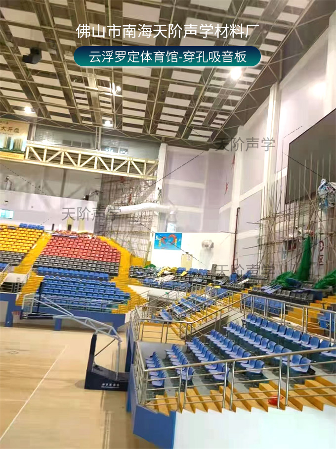 云浮羅定體育場項目改造中,使用平板吊頂空間吸聲體用頂部吸音裝飾;墻面選用白色飾面的穿孔吸音板,基材選用不燃的玻鎂基材,運(yùn)動造型的穿孔設(shè)計,活力動感,有出色的降噪效果。