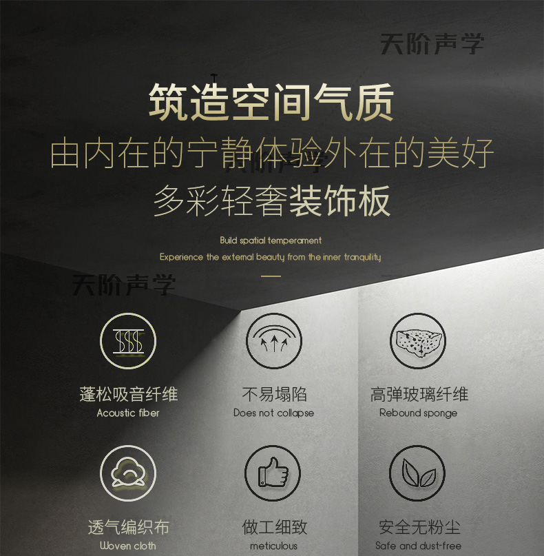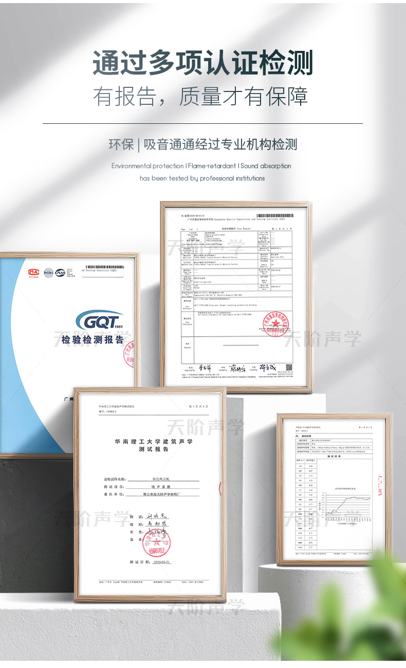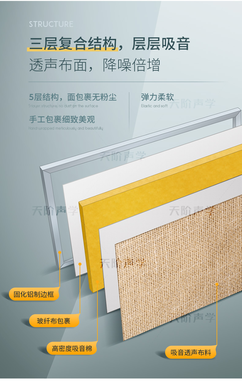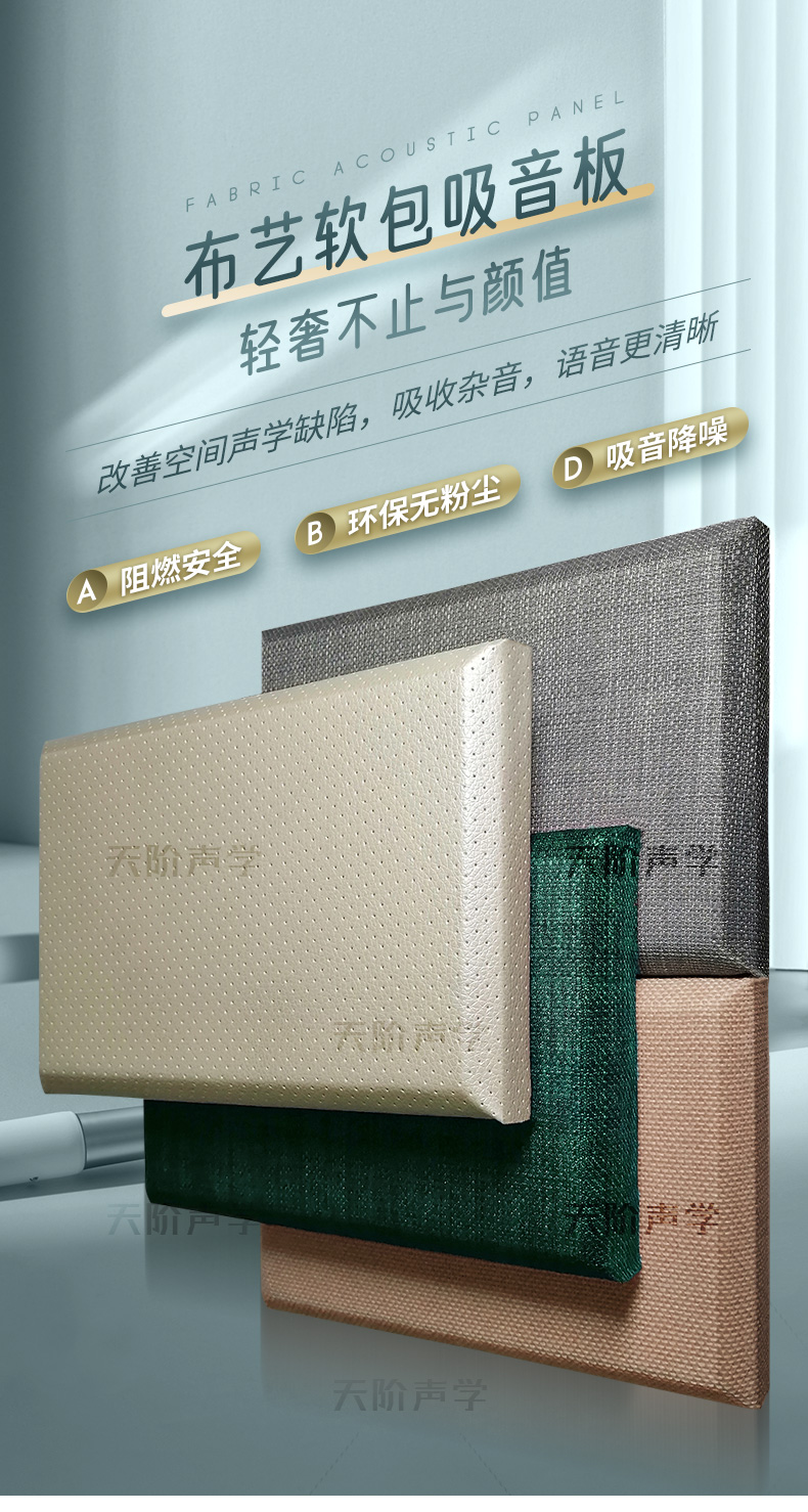 天階聲學(xué)布藝吸聲板采用高質(zhì)的96kg/m3玻璃吸音棉。具有環(huán)保、阻燃、吸聲頻帶寬、裝飾性強、施工簡單、無粉塵污染等性能,飾面顏色及材料選擇性廣,能很好地滿足客戶多樣化的聲學(xué)及裝飾需求。