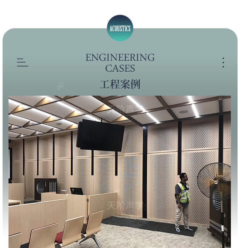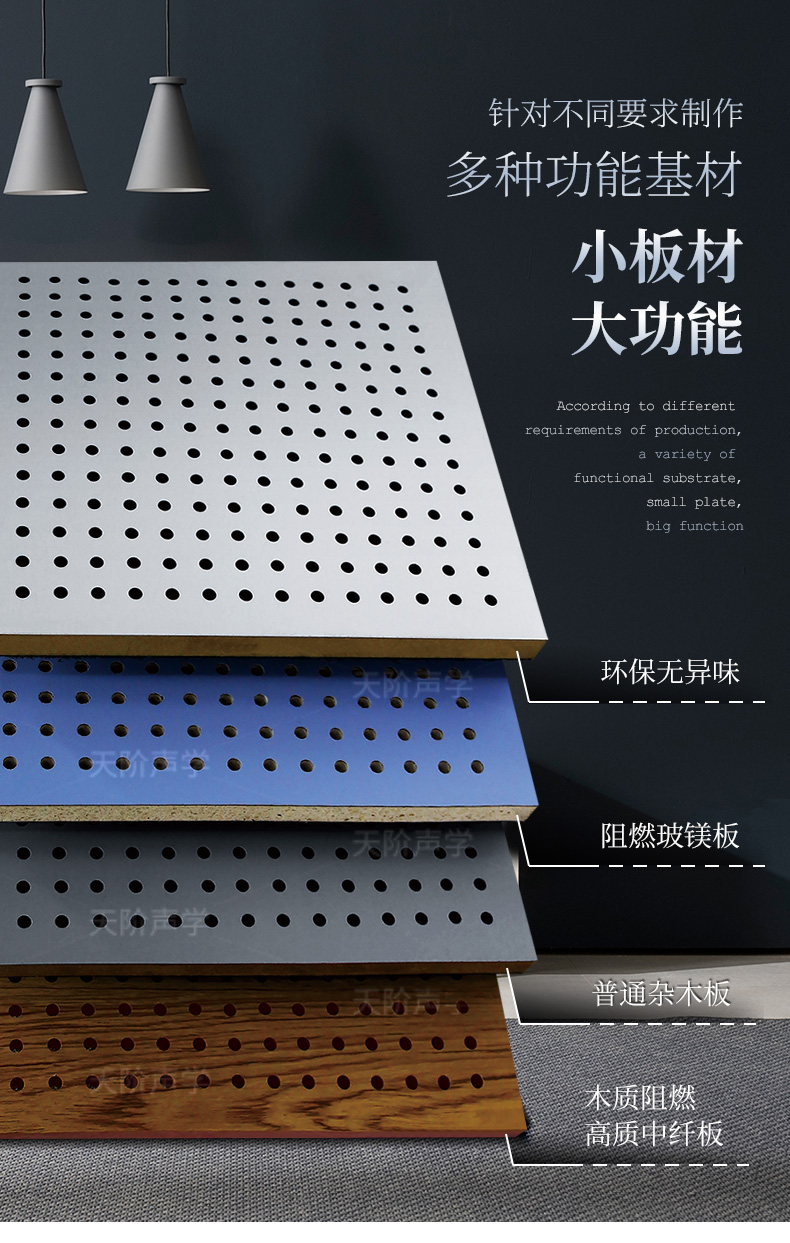 天階聲學(xué)孔木吸音板采用高質(zhì)的中纖板、具有環(huán)保、防火、防潮等性能,飾面顏色及材料選擇性廣,能很好地滿(mǎn)足客戶(hù)多樣化的聲學(xué)及裝飾需求。較槽木吸音板,孔木吸音板相對(duì)抗撞擊能力強(qiáng)。
