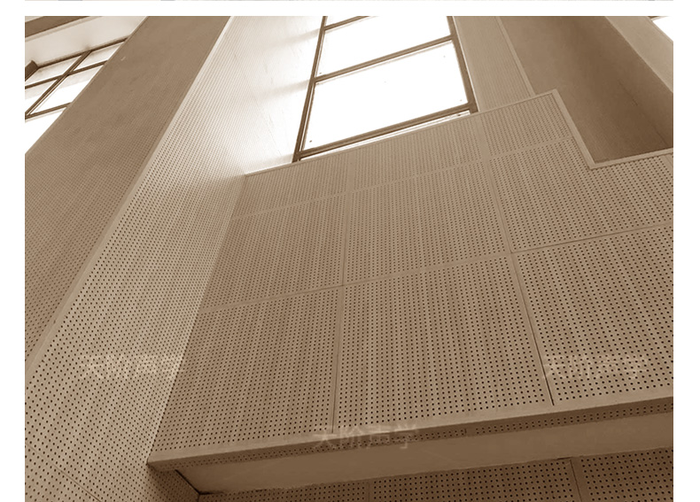 孔木吸音板是一種在密度板上直接穿孔的共振吸聲材料??啄疚舭鍖?duì)吸聲頻譜選擇性較強(qiáng),對(duì)低頻有很好的吸聲性能。如在吸聲結(jié)構(gòu)后空腔上填入適量的吸聲棉可提高中、高頻吸聲效果。