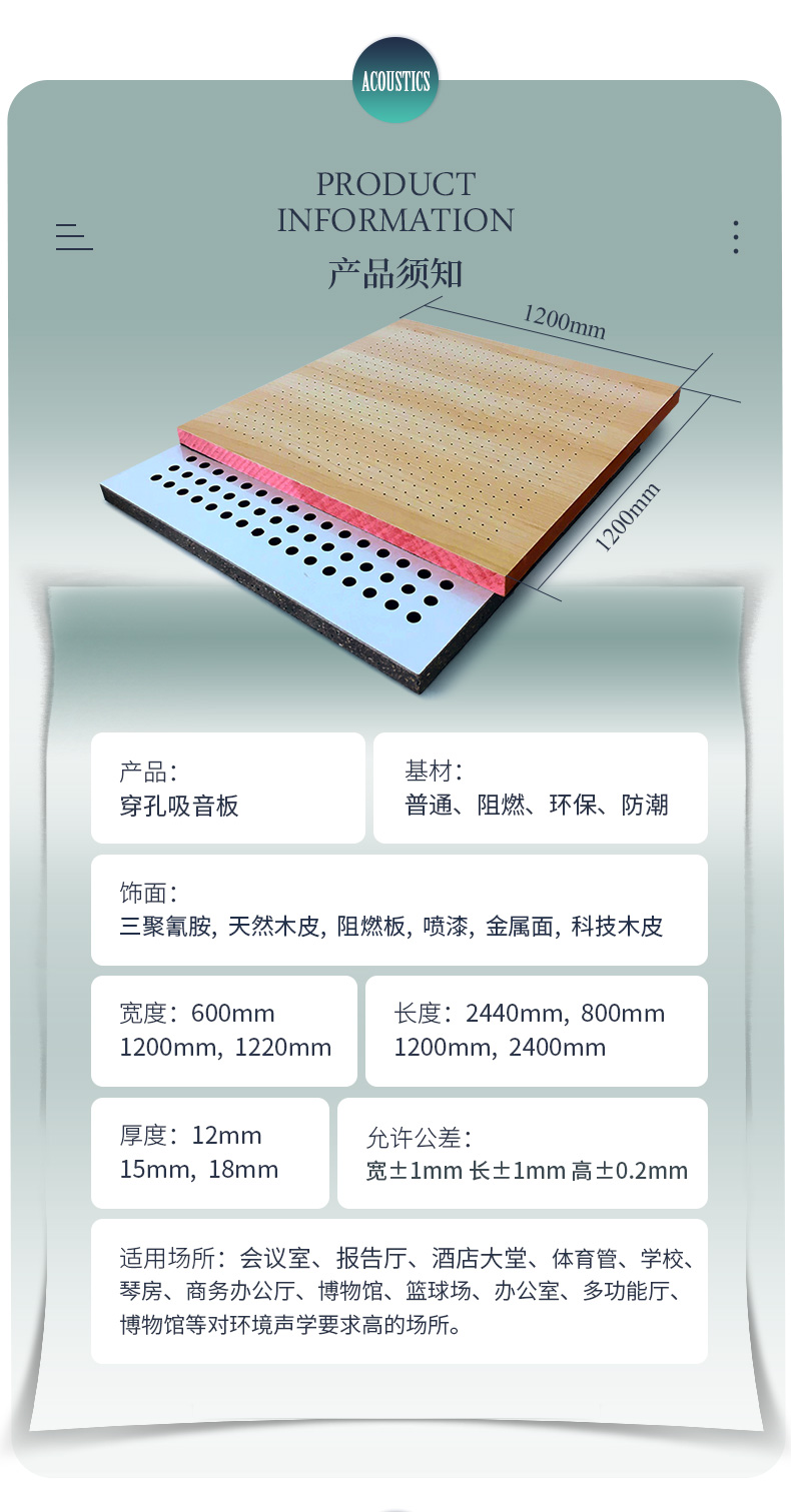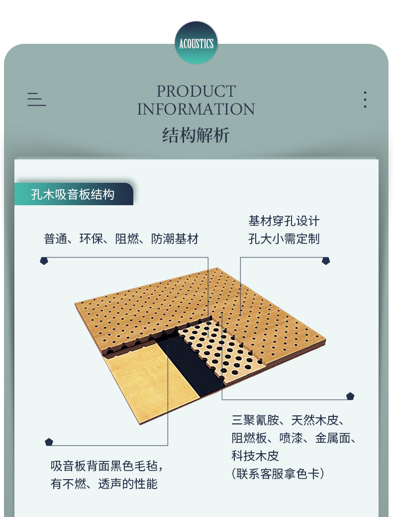 本公司專(zhuān)業(yè)生產(chǎn)木質(zhì)吸音板,布藝吸聲板、吸音軟包、木絲吸音板、聚酯纖維吸聲板、蜂窩陶瓷吸音板、隔音板、空間吸聲體、擴(kuò)散體、隔音材料、干掛板與聲學(xué)活動(dòng)隔斷、固定高隔間等多種聲學(xué)品類(lèi)。
