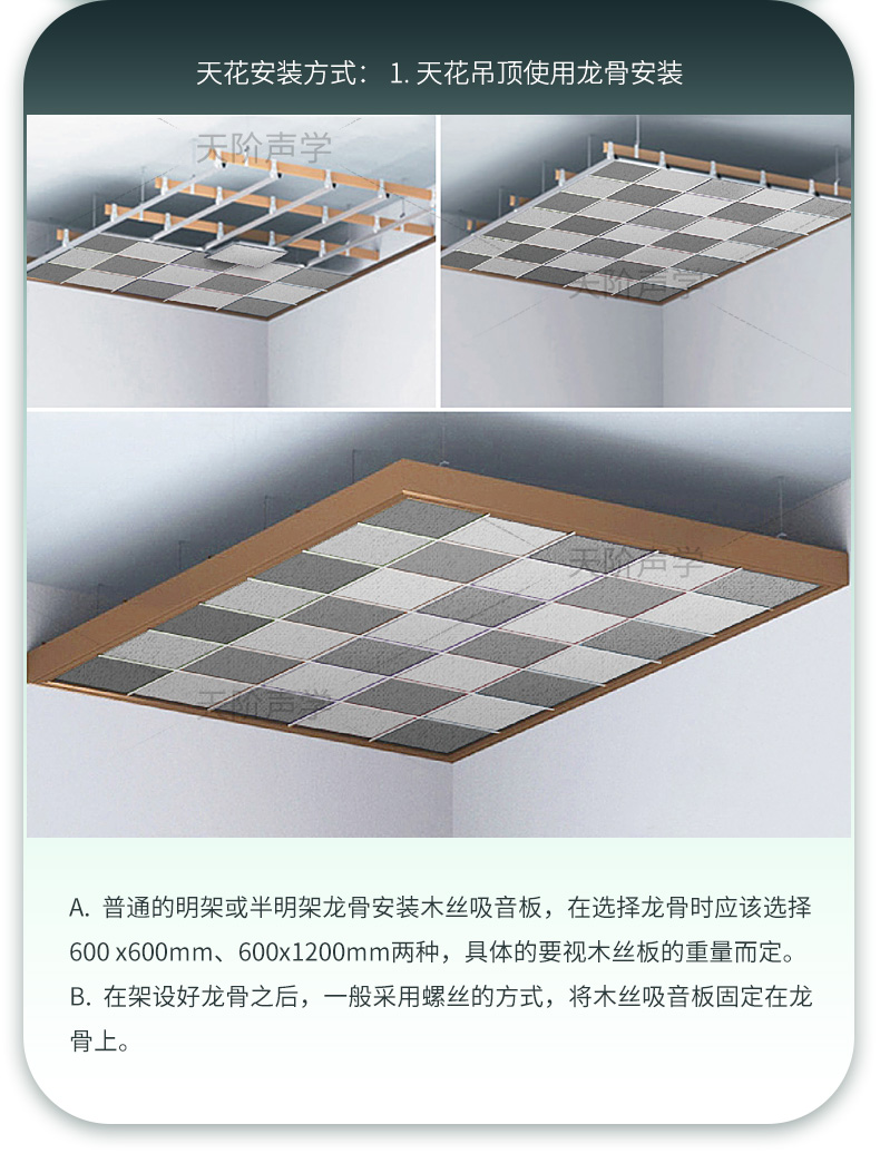 c.輕鋼龍骨,在高層較高或防火要求等級(jí)較高的時(shí)候,可能不允許施工木龍骨的情況下,一般采用爆炸螺絲吧小段的木墊片固定在輕鋼龍骨上,然后將木絲吸音板固定在木皮上即可。